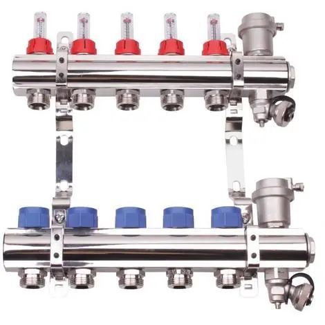 – Collecteur en laiton chromé pour plancher chauffant, équipé de débitmètres incorporés, purgeurs d’air, robinets de vidange.