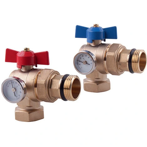 2 vannes coudées avec thermomètre pour collecteur PCBT laiton brut Somatherm.
